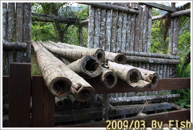 利用中空的大竹子、筆筒樹的樹幹與九芎枝幹等天然材料,製作出一個三層的結構物放入水塘中,